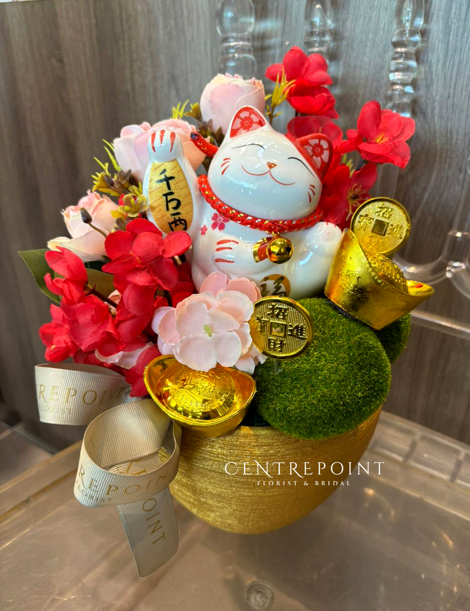 Congratulatory flower box with special maneki neko feng shui chinese lucky cat figurine decoration for any grand openings or happy ceremonies. Send your blessings and best wishes to the ones you care.