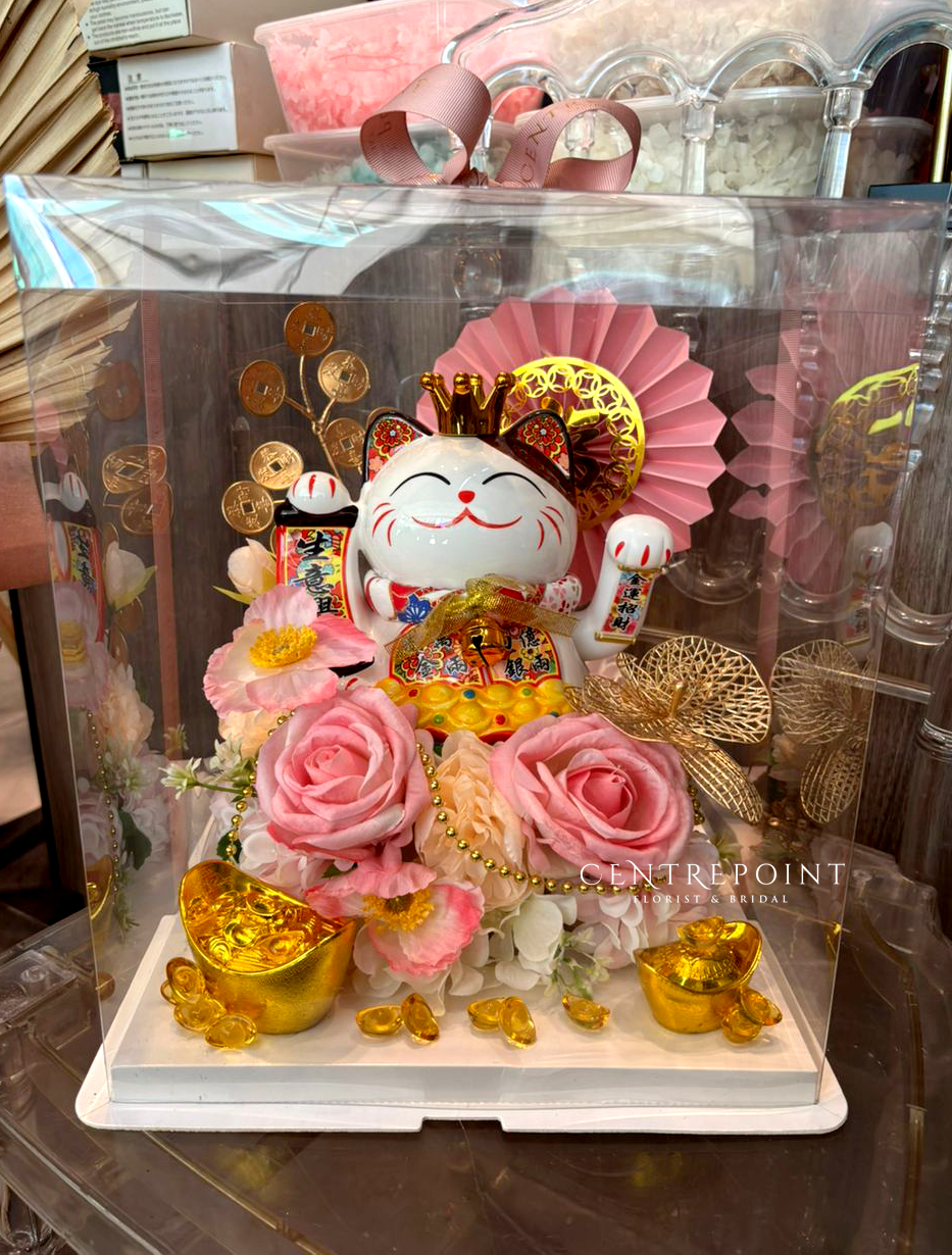 Congratulatory flower box with special maneki neko feng shui chinese lucky cat figurine decoration for any grand openings or happy ceremonies. Send your blessings and best wishes to the ones you care.