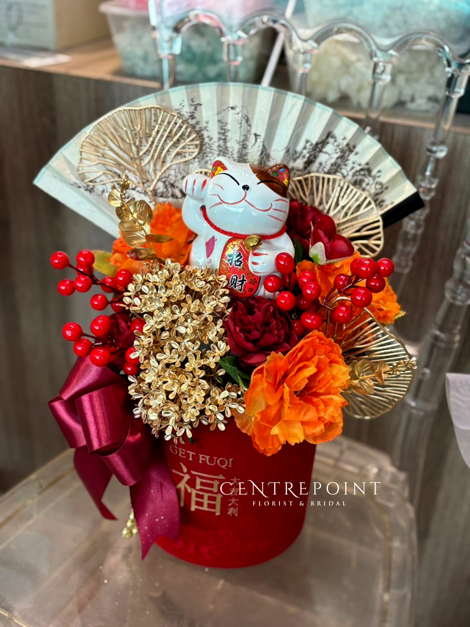 Congratulatory flower box with special maneki neko feng shui chinese lucky cat figurine decoration for any grand openings or happy ceremonies. Send your blessings and best wishes to the ones you care.