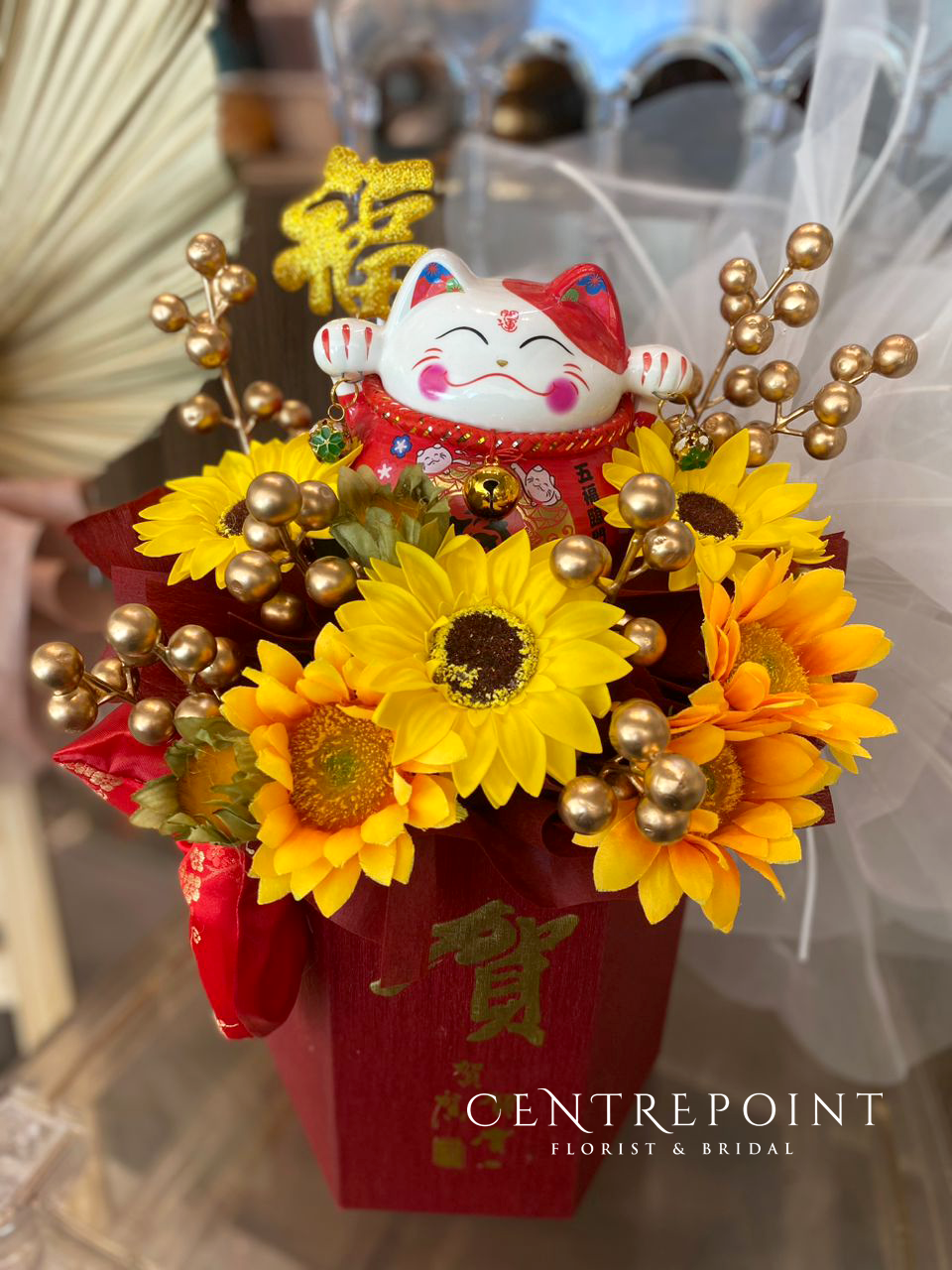 Congratulatory flower box with special maneki neko feng shui chinese lucky cat figurine decoration for any grand openings or happy ceremonies. Send your blessings and best wishes to the ones you care.