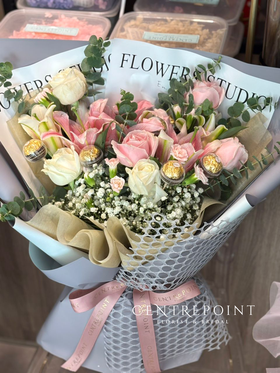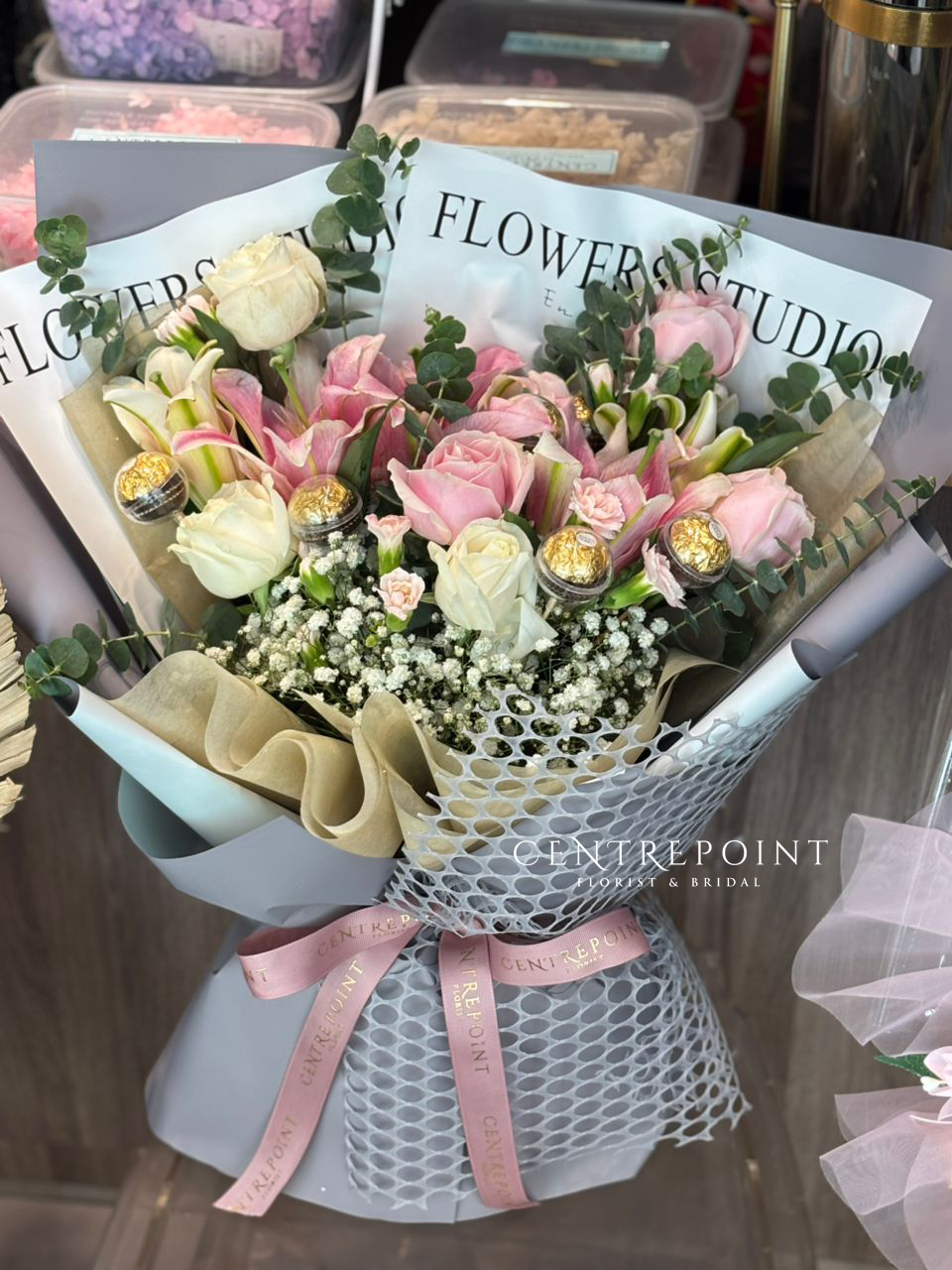 Flower : 3 stalks of lilies, 8 stalks of roses and 6 pieces of ferrero rochers.