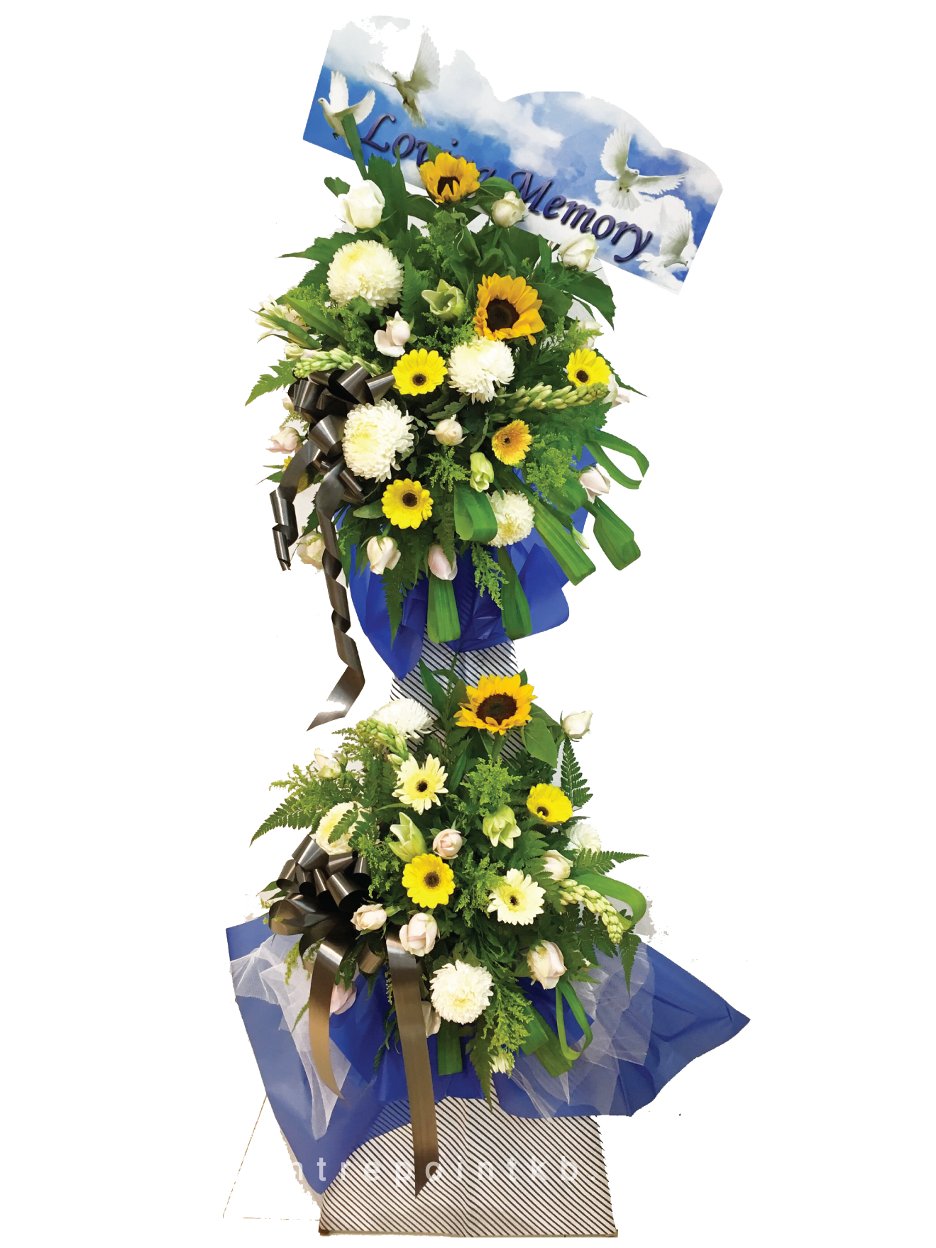 A 2 tier condolence flower stand to grieve for the ones you care. Pay your last respect to the demised, and show that you are thinking of them in your prayers.