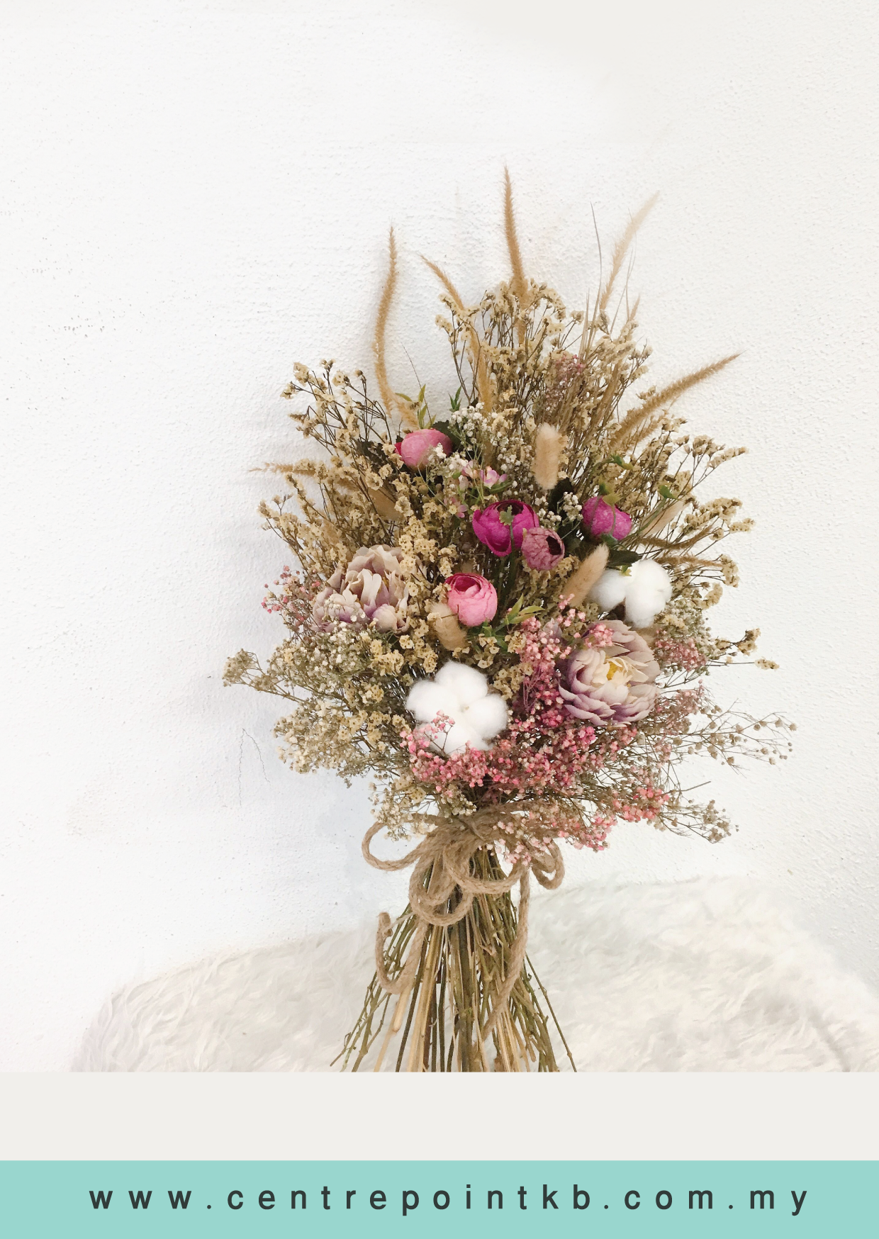 Flower : Premium Artificial Peony + Fox Tail Flower + Caspia Dried Flower + Baby Breath Spray