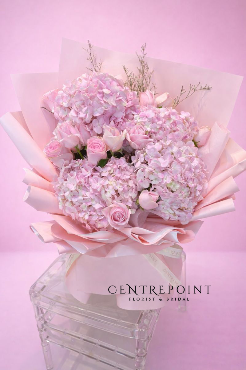Flower : 5 stalk hydrangeas and pink roses.
