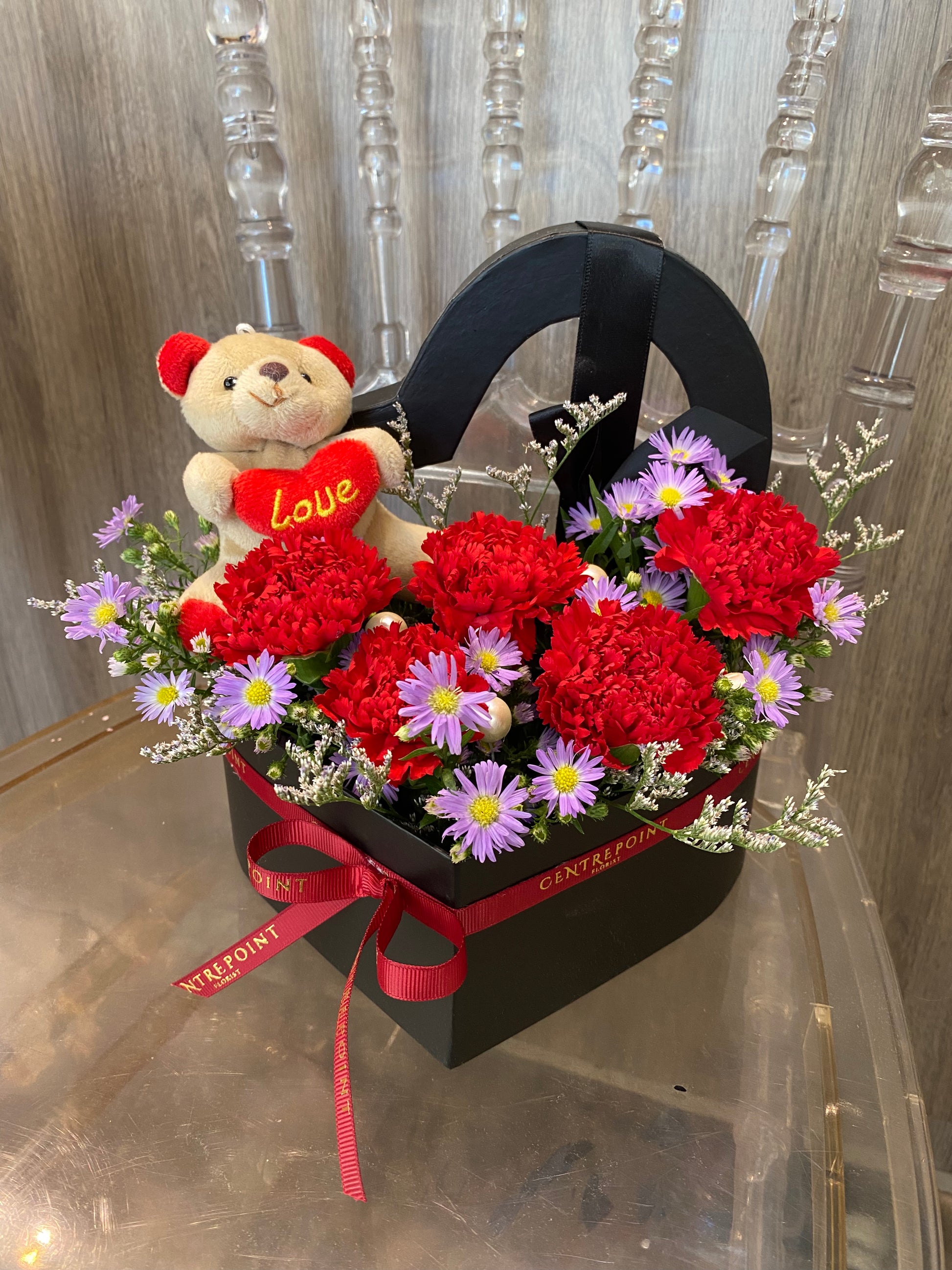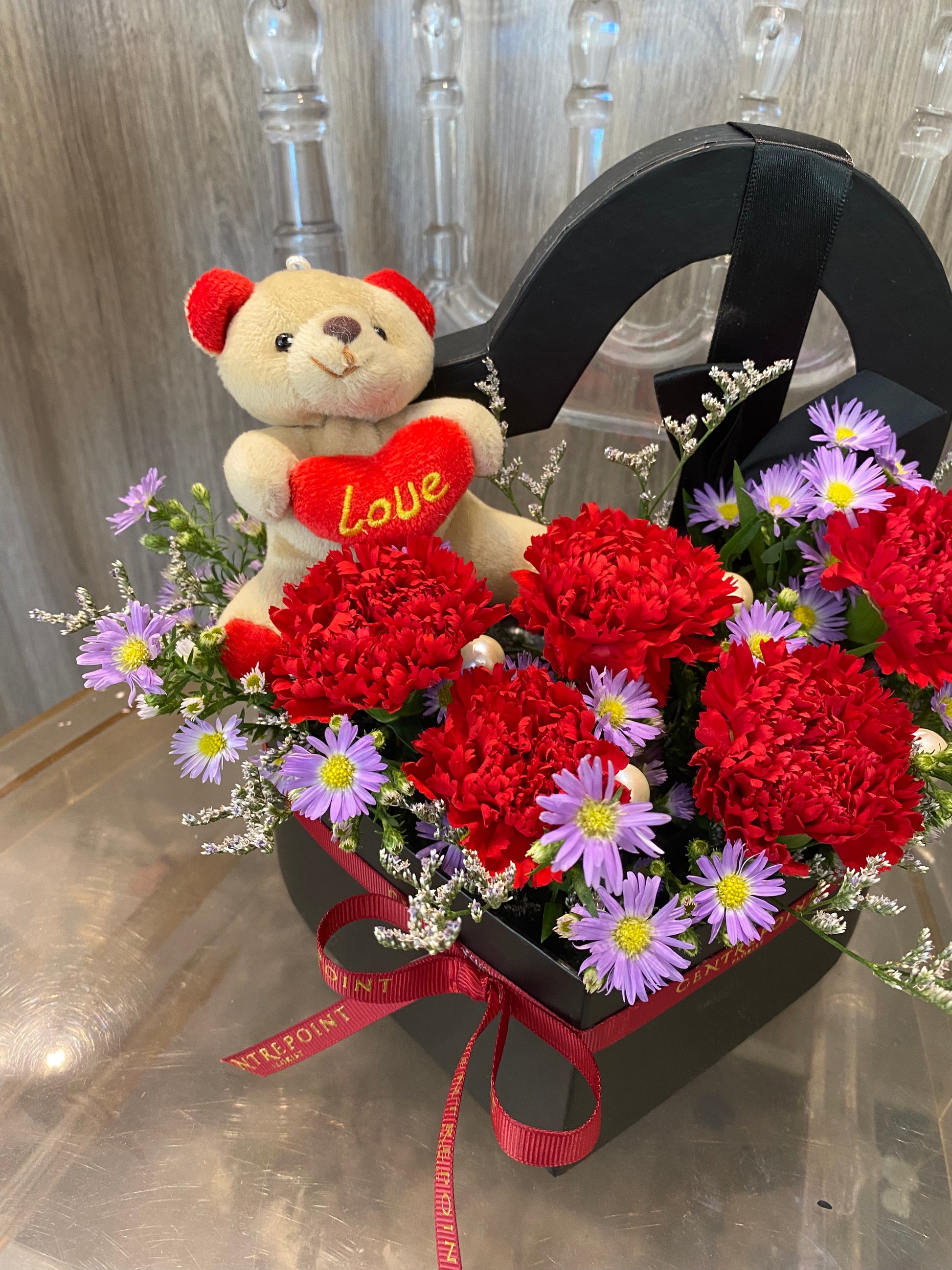 Flower : 6 stalk of fresh carnations with some fillers + Mini Bear