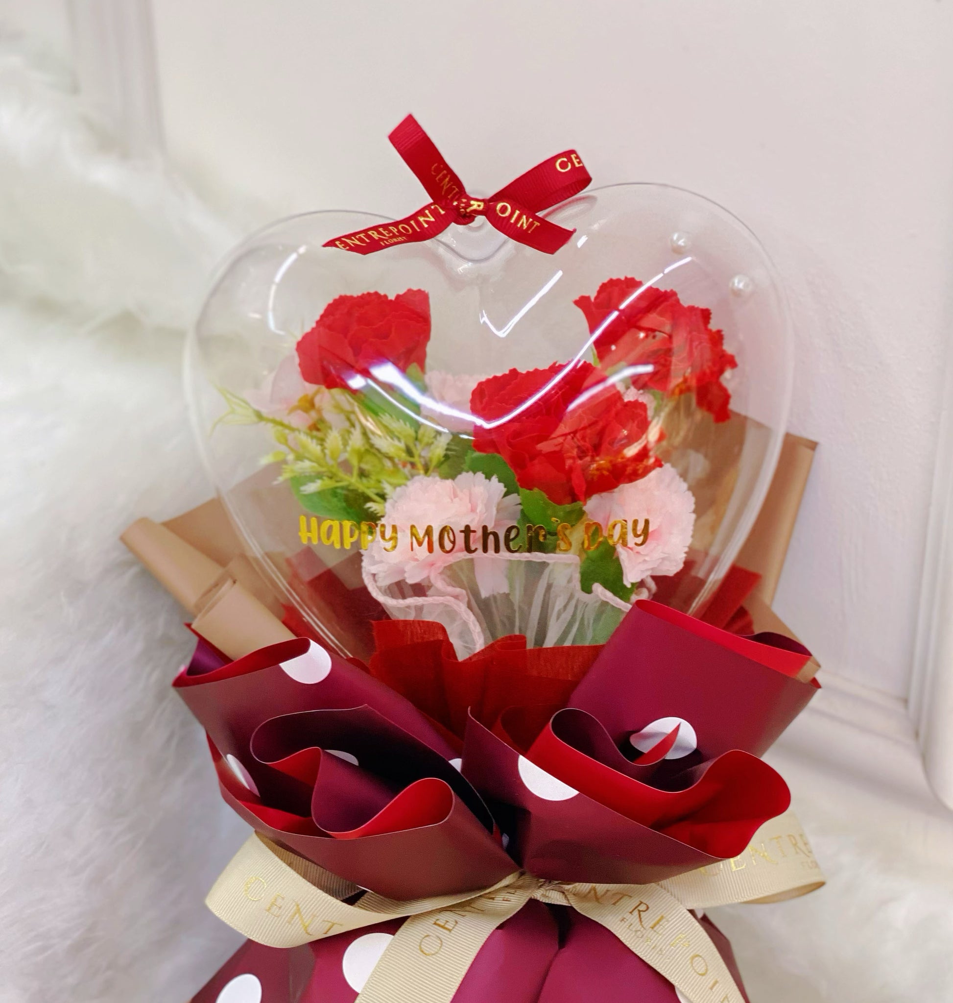 Flower : 3 stalk of soap flower carnations in heart shaped acrylic ball