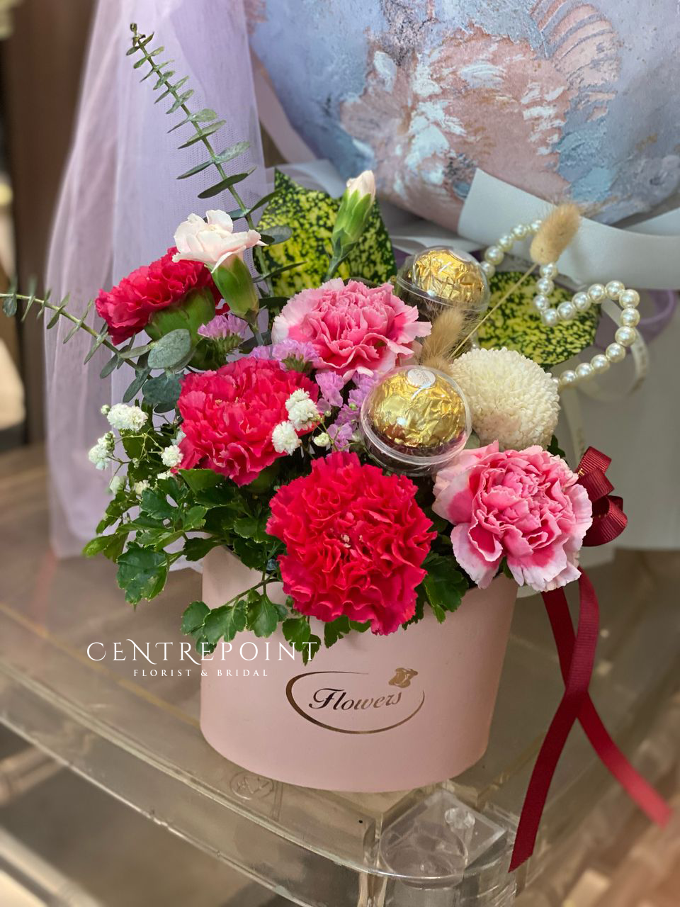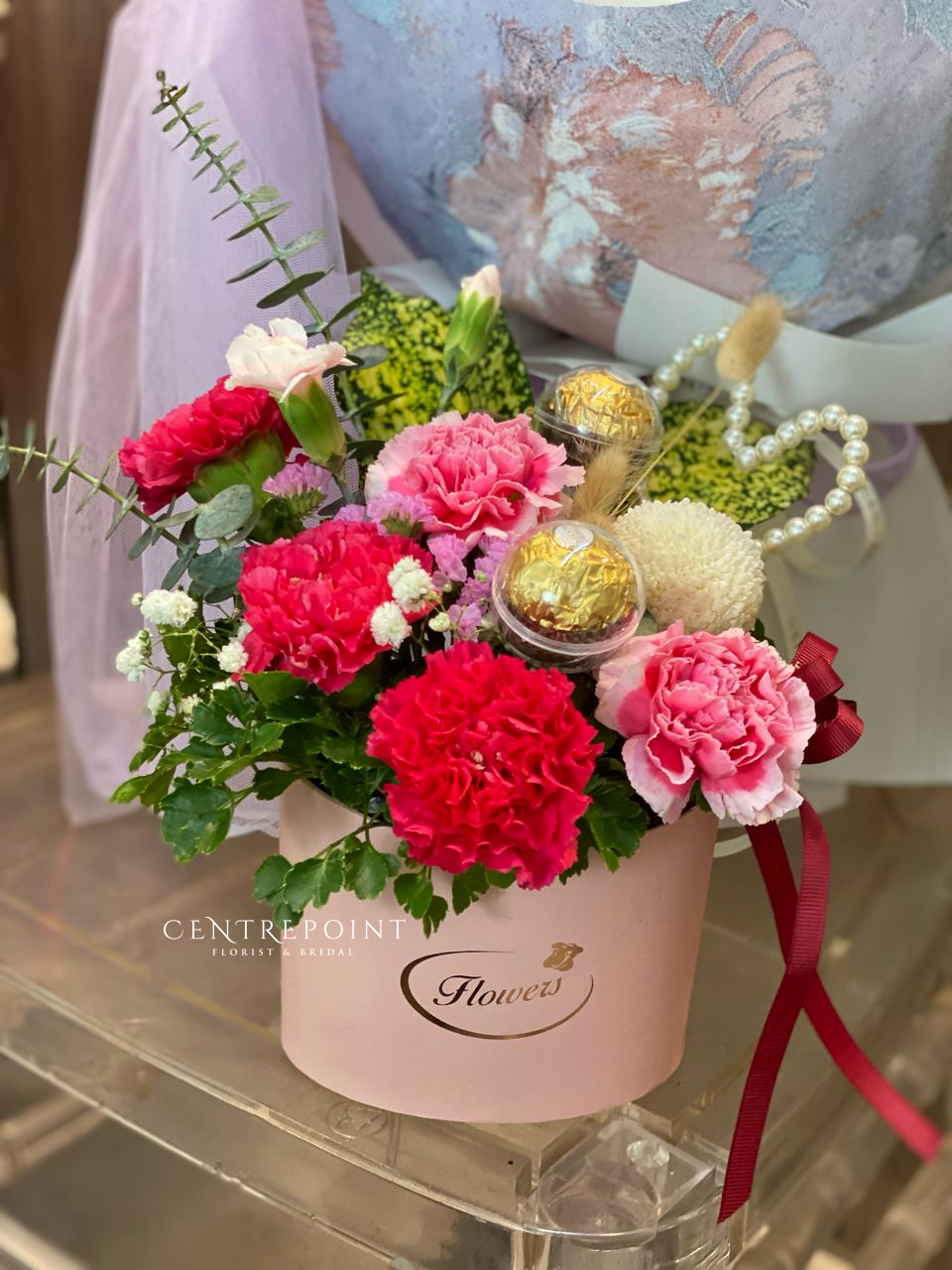 Flower : 5 stalk of fresh carnations with ping pong flower + 2 pieces of ferrero rochers.