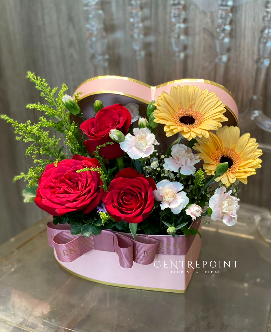 Flower : 3 stalk of roses with 2 stalk of daisy in premium heart shape box