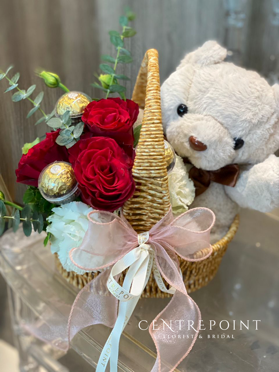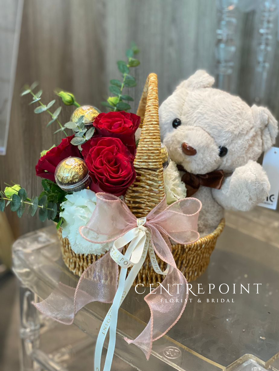 Flower : 3 stalk of roses + 3 pieces of ferrero rocher & medium size teddy bear