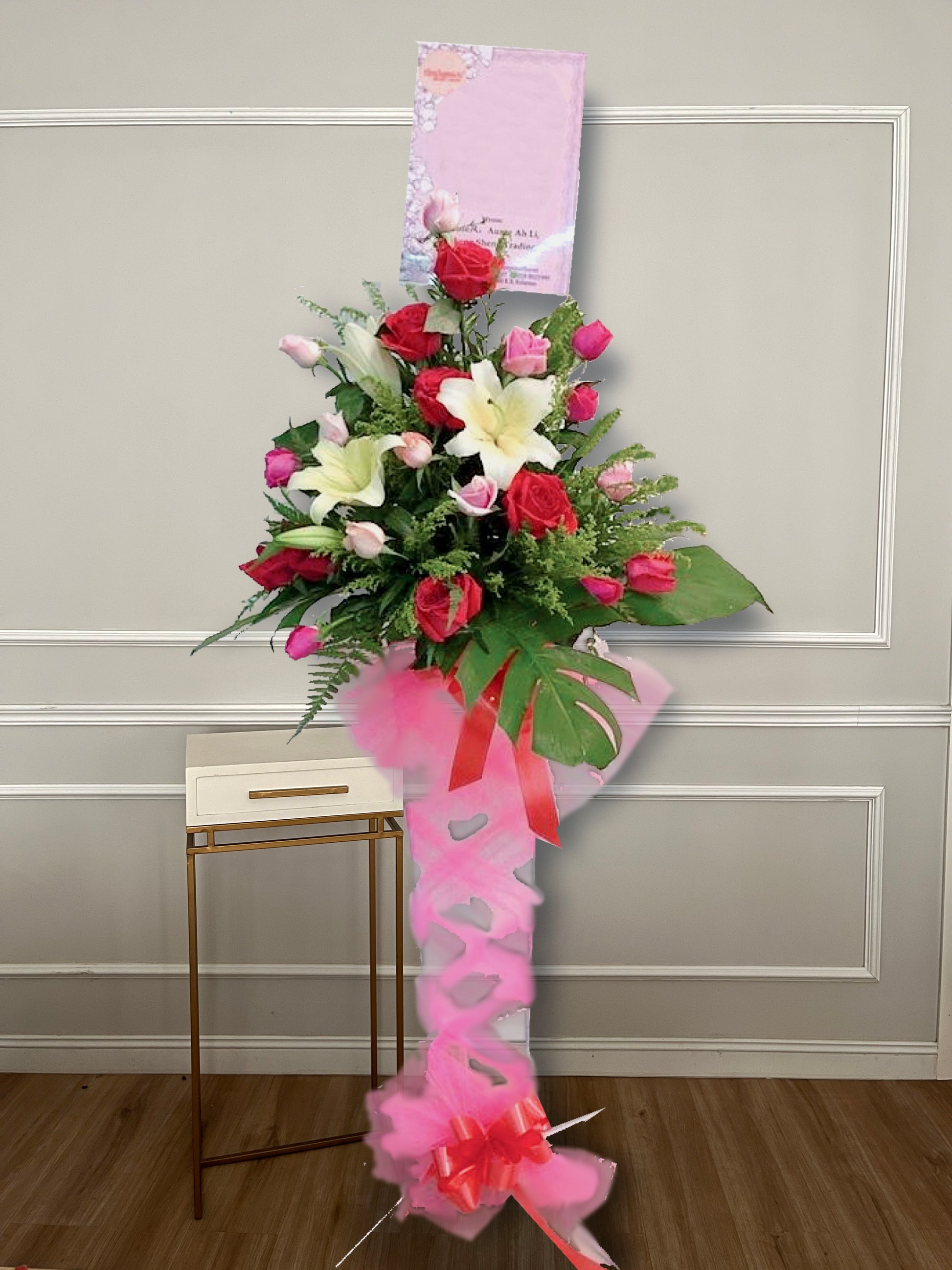 One layer congratulatory flower stand for any grand openings or happy ceremonies. Send your blessings and best wishes to the ones you care.