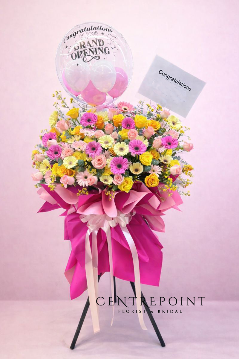 One layer congratulatory flower stand with special confetti balloon for any grand openings or happy ceremonies. Send your blessings and best wishes to the ones you care.