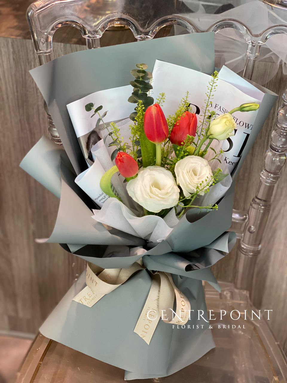 Flower : 3 stalk of tulips & eustoma